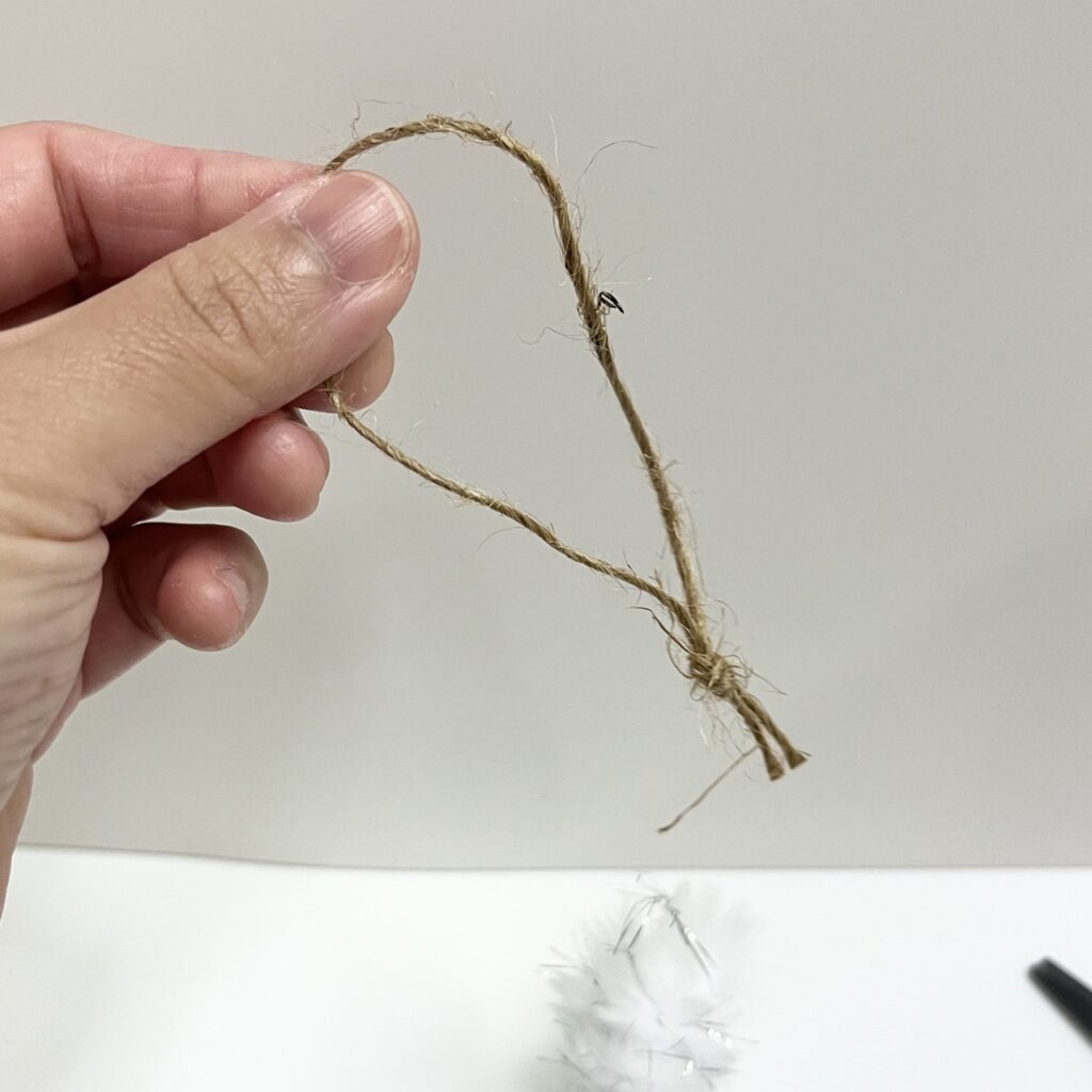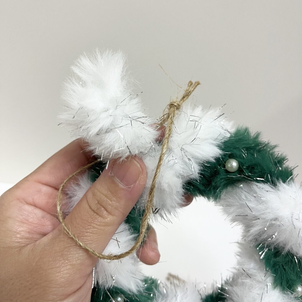 5・麻ひもを15センチほど切って輪っかに結び、リースにつけます