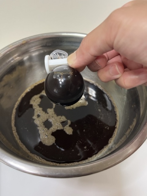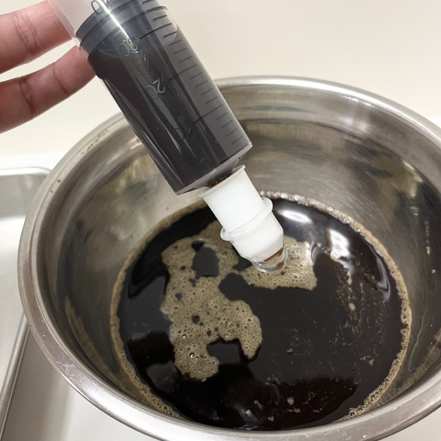 コーヒー液をシリンジで吸い上げ、風船にいれていきます!