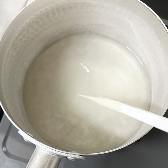 1、粉寒天4gと水250mlを鍋に入れ、ヘラでゆっくり混ぜながら寒天を溶かしていきます