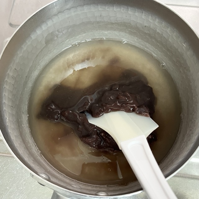 4、こしあん200gを投入!弱火のままゆっくり混ぜて溶かしましょう