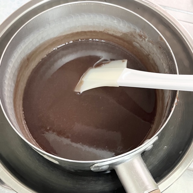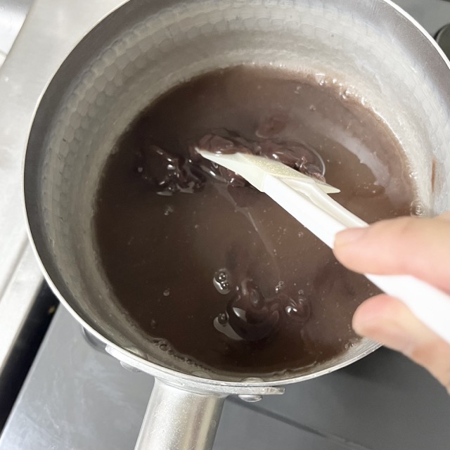 5、完全に溶けたらすぐに火を止め、鍋の底を水に当ててヘラで混ぜながらとろみがつくまで冷まします!これで、水ようかん液の完成です!